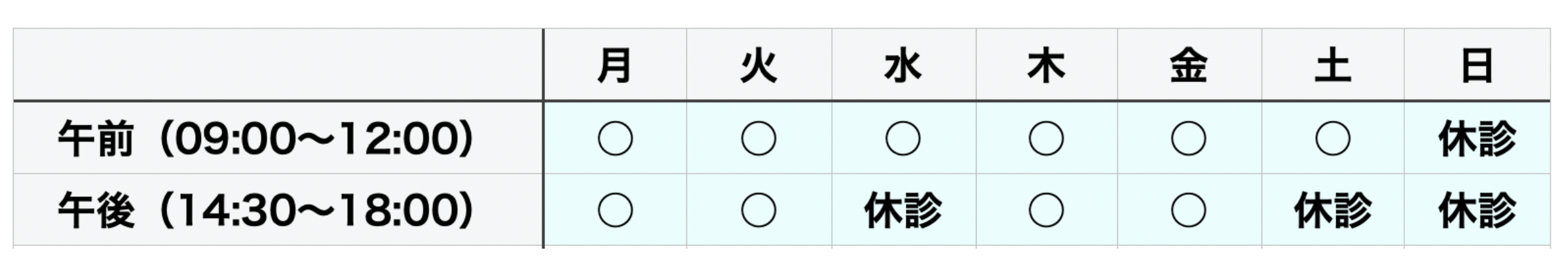 診療時間 午前9:00〜12:00、午後14:30〜18:00